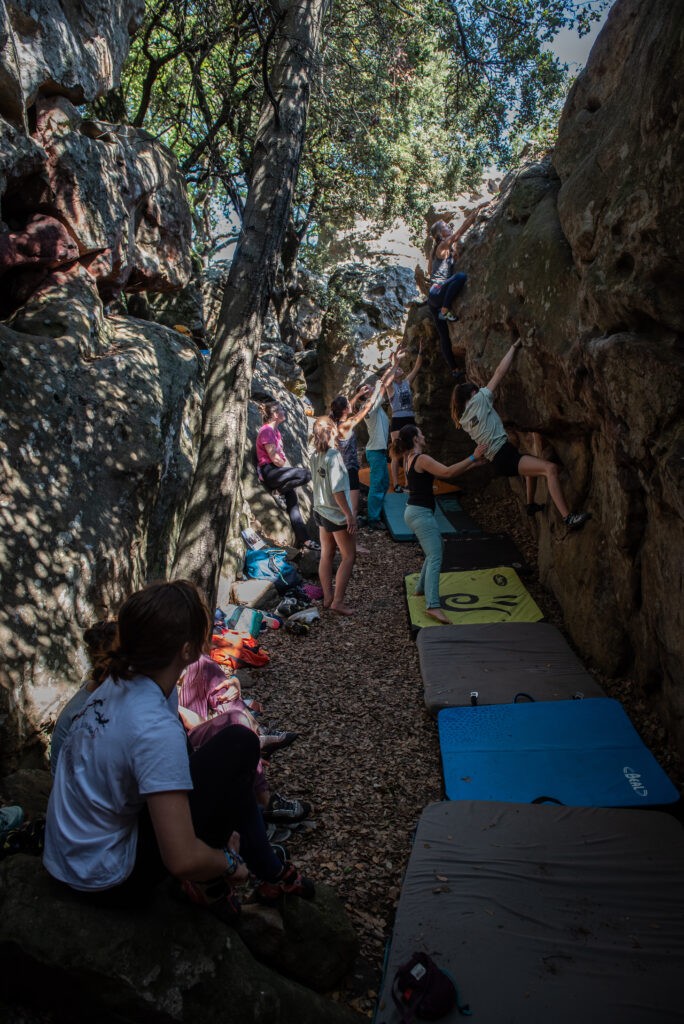-11h-17h : escalade avec coaches (Marion Poitevin, Stéphanie Bodet, Coralie Havas, Caroline Ciavaldini, Martina Cufar, Fanny Girard, Isabelle Carrier, Salomé Romain) avec discussions en forêt sur les themes: